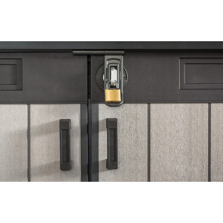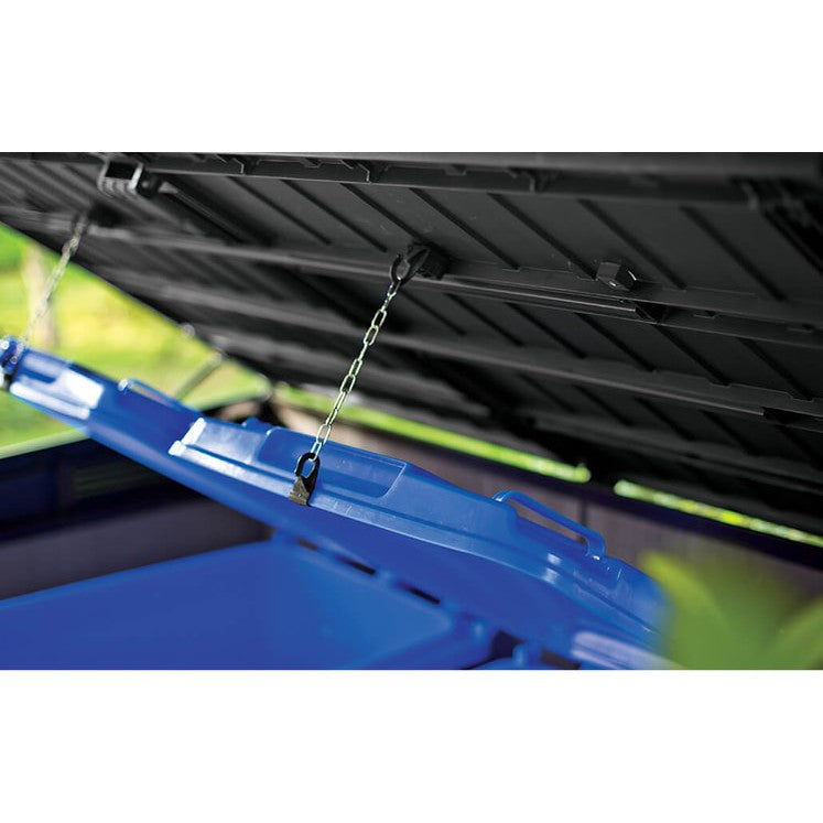 This Keter storage shed Grande Store will withstand any weather conditions and will maintain its appearance without requiring maintenance. The paintable walls allow you to customise the unit to be uniquely yours, and save you from worrying about rust, fading, dents, or peeling. This shed presents the perfect storage solution for two 360 L/96 gal. or three 240 L/63 gal. wheelie bins, two adults and two children’s bikes, or gardening tools. Additionally, a wooden shelf can be installed using the included adjustable brackets to expand the storage options. This storage unit also has a sloping threshold, a locking system, built-in ventilation and adjustable brackets to install an extra shelf.
